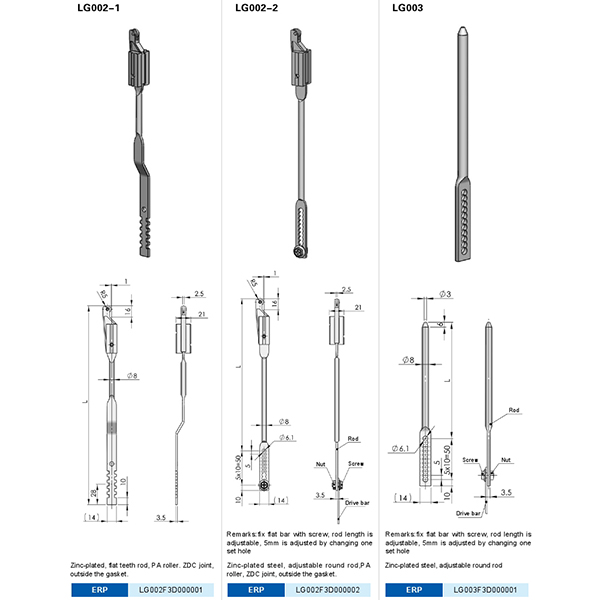| LG002-1 | Flat teeth rod, adjustable with ZDC joint | LG002F3D000001 | Adjustable rod length, corrosion-resistant finish |